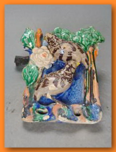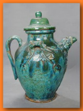 在追溯石灣藝術陶瓷的源流時,我們很多時會想到河宕遺址的印紋陶或者瀾石的古墓葬出土的陪葬物,但這不應該成為石灣藝術陶的真正源流。正如陶器的出現,世界各地是不需要互相學習而自發產生的。印紋陶和漢墓葬在全國范圍內許多地方都有出現,在石灣及周邊地區出土的陶器并未顯露出后來石灣窯藝術陶瓷的明顯特征,只可以說明石灣地區開始有人做陶,隱含了制陶的基因。石灣藝術陶瓷真正起源于明代,這是得到眾多文化學者的認同。在藝術陶的五大種類中,較早出現的是藝術器皿。明代蘇可松的《翠毛釉貫耳瓶》是現今保存較好的有作者姓名,年代確切的作品。根據記載,明代陳粵彩、楊升、揚名都是擅于制作器皿的名家,雖然沒有見到過他們作品的存世品,但他們的名字能流傳下來,作品也不是一般的日用器。“陳粵彩經常使用醬黃釉、綠釉等制作器物,作品較為細致整齊”,“楊名傳世器多仿古銅器,精制黑釉,常用黑白兩種釉色,簡潔樸素”,“楊升作品多仿漢代銅器式樣,擅長粉藍色釉”。這些明代的陶藝名家做的已不是一般的日用陶器,在造形和施釉方面都有一定追求的工藝美術品,作品因廣受歡迎和珍惜才會使作者留名后世。從清代大量生產的日用器皿,有不少看到藝術陶器的影子。如白釉行(古石灣陶業行會之一)的飯豉(罐),用于從廚房的大鐵鍋里盛飯到飯廳的容器,上面有浮雕龍、雞等圖案裝飾,還覆蓋了漂亮的黃釉或綠釉;花盆行(古石灣陶業行會之一)的藥酒壺(高約80~90厘米),以龍頭作壺嘴,梅花或竹裝飾壺耳;掛在墻上的掛壁,裝飾以動植物的造型,中空又可盛水養植物?傊,石灣生產的陶瓷制品中既實用又美觀的比比皆是。石灣日用陶瓷的生產始于唐宋,到明清達到鼎盛。隨著銷售的暢旺、見識的增加,將日用陶器做得更精美,提高其附加值,這是石灣制陶者和商家很易會想到的,日用陶器的造型也從簡單到復雜,釉色從單調到豐富,從而促使石灣藝術器皿的產生和成熟。