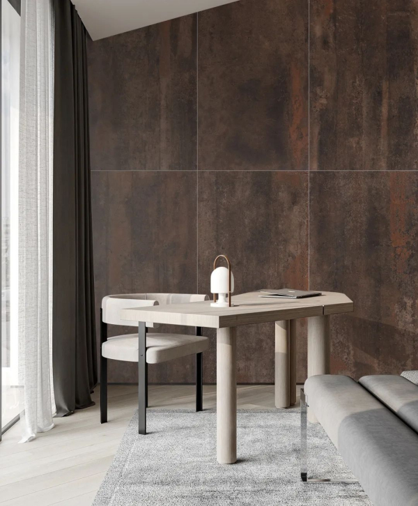 金屬質感是當今瓷磚行業流行的風向標,它外表酷味十足,金屬質感明顯,著色穩定,亮麗,給人們以視覺上的美艷沖擊,裝飾效果依據選擇的花色,呈現出華麗、野性、質樸等不同的美感。