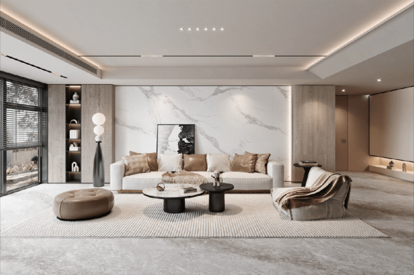 尊石2.0系列通過精心調整原料配方與生產工序,與第三代數碼模具技術融合,呈現出寬細靈動、深淺有度的立體肌理,打造出“一面雙觸”的細膩手感。利用先進的噴墨聯機打印技術,將圖案與凹凸表面精確對齊,真實還原稀有石材的質感,營造輕奢的無界美學空間。
