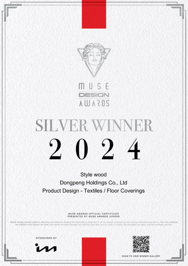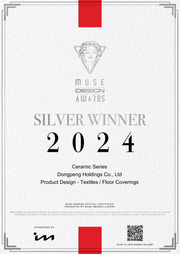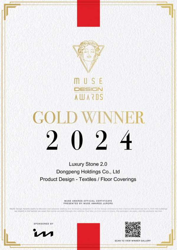 近日,全球建筑與設計領域最具影響力的國際獎項之一“美國繆斯設計獎(MUSE Design Awards)”2024年獲獎名單重磅揭曉,東鵬2024年新品從全球數以萬計的參賽作品中脫穎而出,以卓越實力榮獲“一金二銀”三項大獎。其中,尊石2.0系列榮獲MUSE金獎(GOLD WINNER),大地系列、原木系列均獲MUSE銀獎(SILVER WINER)。
