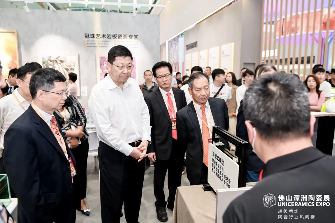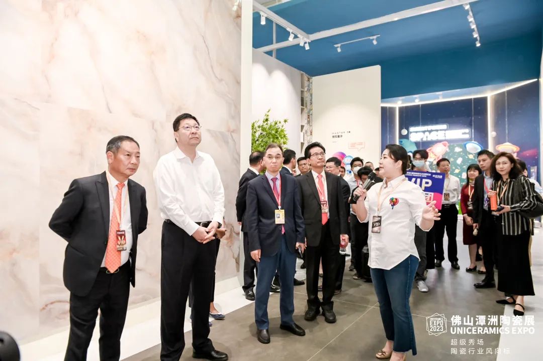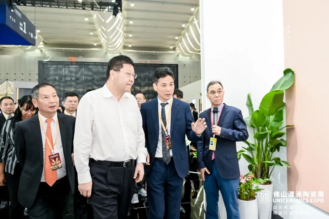 上午9時,2023佛山潭洲陶瓷展在潭洲國際會展中心1號館舉行了開幕式。佛山市長白濤親臨展會現場,參觀了冠珠、宏宇、薩米特、馬可波羅、蒙娜麗莎、諾貝爾、順輝、大將軍、鷹牌生活、越南VCG等展館,對參展企業產品、設計及空間應用展示做出了高度評價。